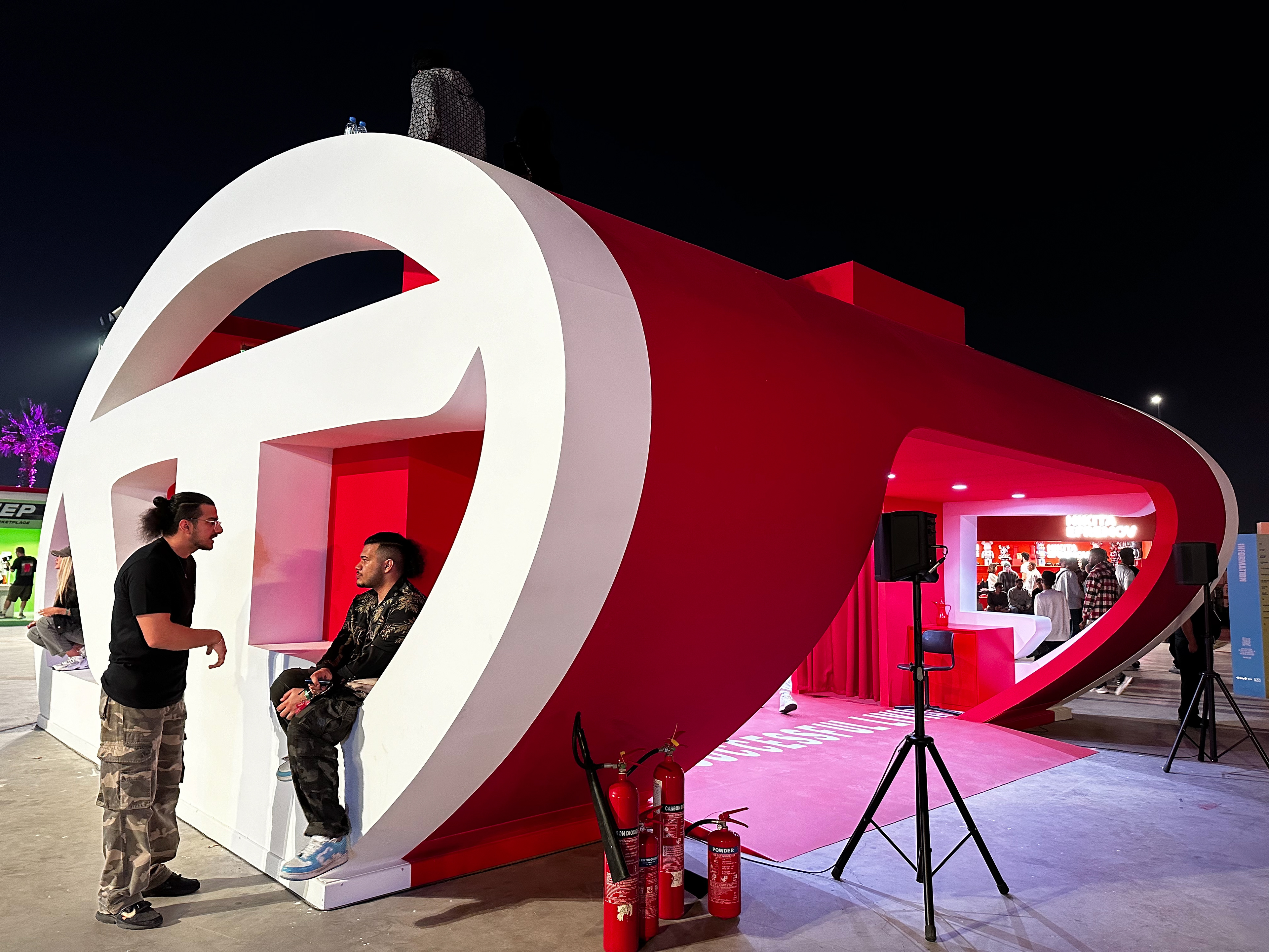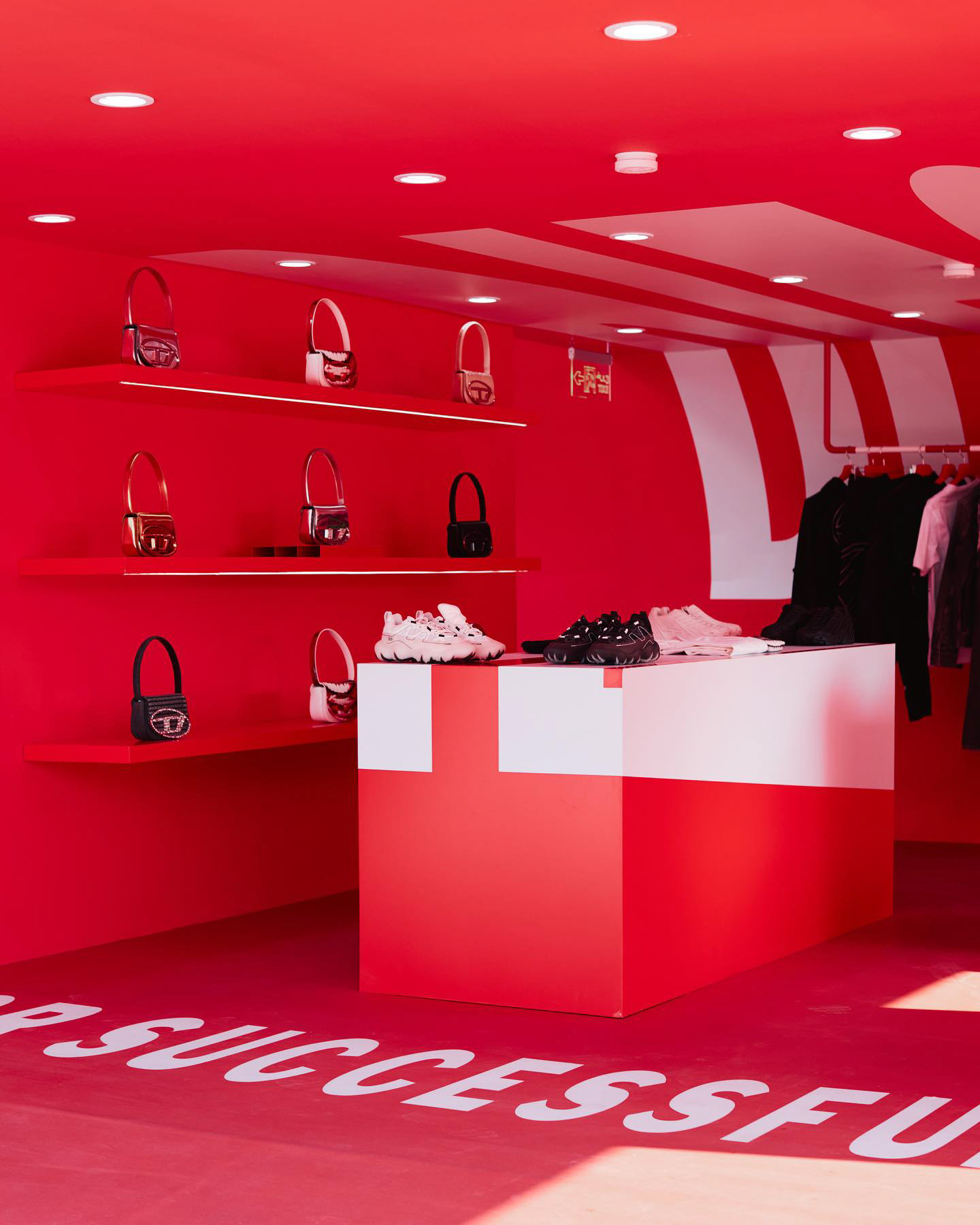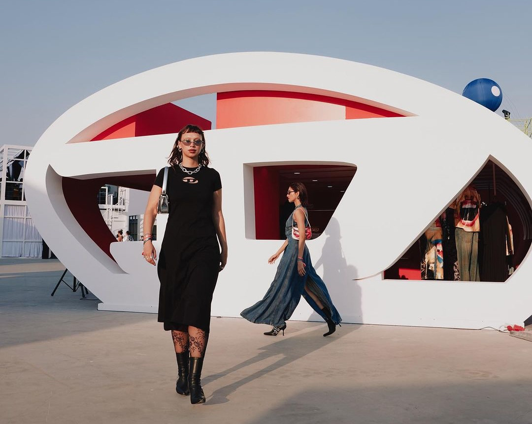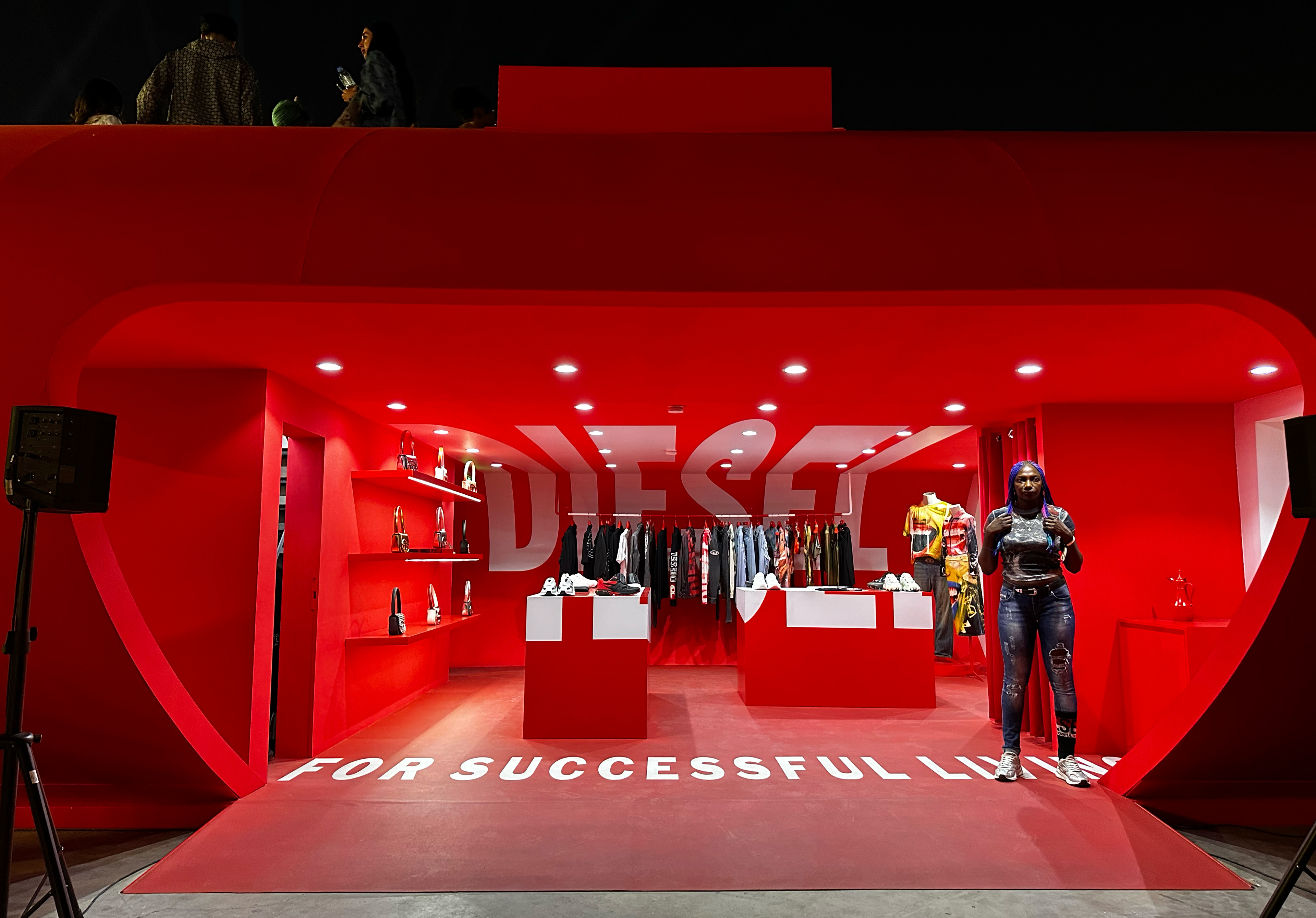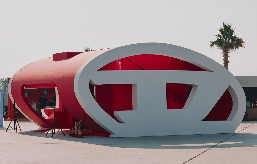 A bold two-storey fashion activation at Dubai Design District, immersing guests in Diesel’s world through sculptural form, light, and materiality. The architectural structure became a canvas for the brand’s iconic logo, which was projected continuously through the space, flowing across floors, walls, and ceilings to create a fully enveloping visual language. Inside, the vivid red interior amplified the intensity of the brand experience, blurring the boundaries between retail, installation, and art. On the upper level, the projection extended even further, wrapping over soft furnishings with the logo mapped directly onto the cushions of the seating, reinforcing the idea that every surface was part of the narrative. The result was a highly immersive environment that fused fashion, culture, and spatial design into a single, unmistakably Diesel experience.