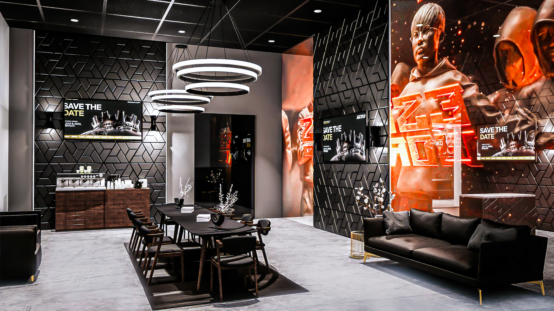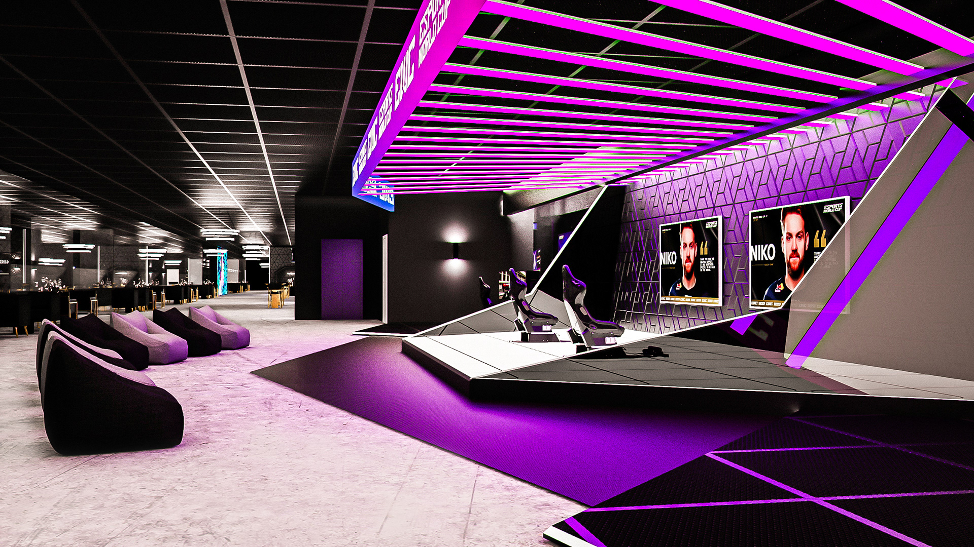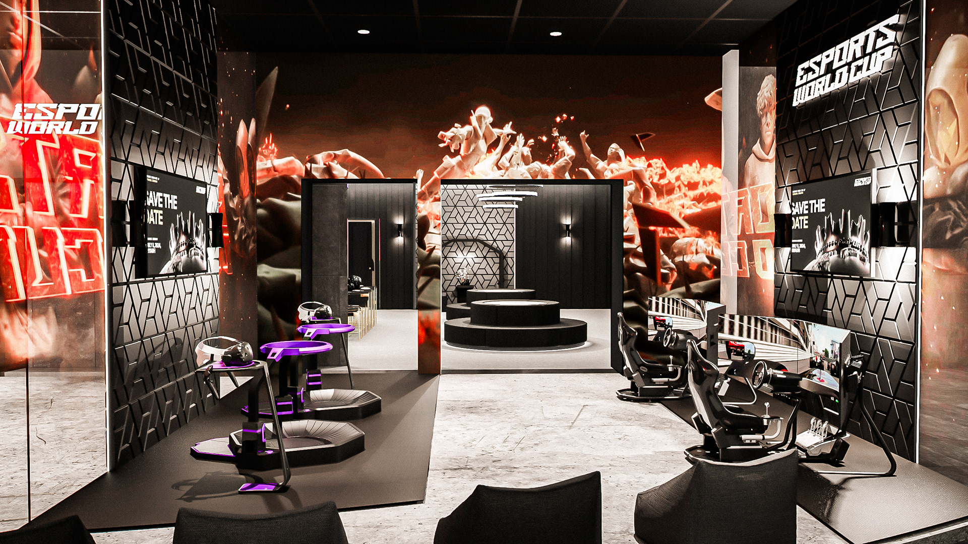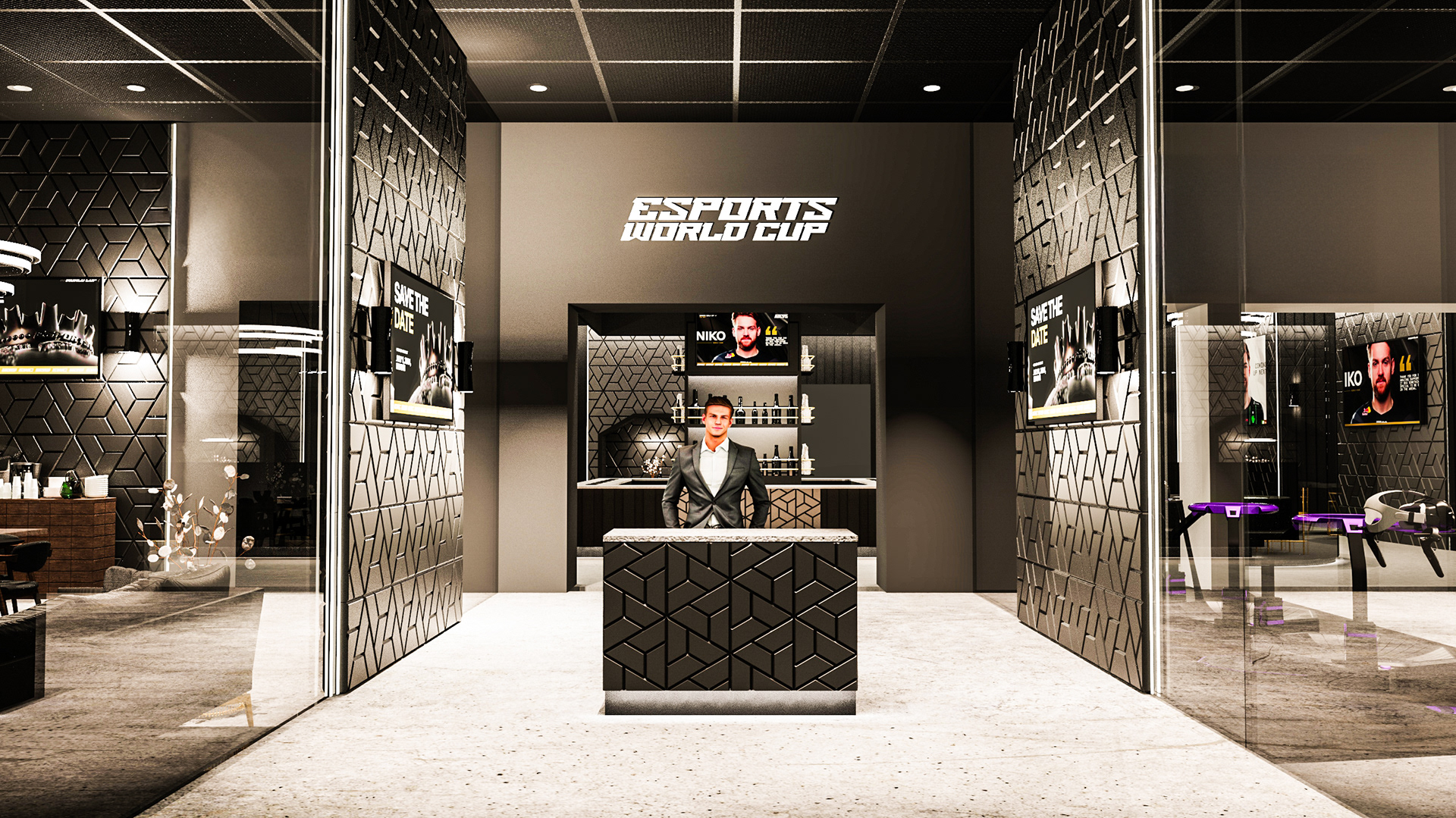 This project was designed for the Esports World Cup (EWC) to deliver visual mockups, renders, and floor plans for two VVIP lounges within a large-scale international gaming event. The concept blended the energy of competitive gaming with high-end hospitality design. Each space featured premium materials such as leather, marble, wood, and brushed metal, contrasted with dynamic LED lighting and customizable ambient effects. The result was a luxurious yet adaptable environment that reflected the excitement of the arena while providing an exclusive retreat for top players, partners, and guests.